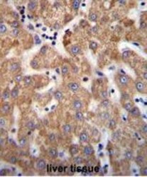 - ANKRD58 Antibody (C-term) immunohistochemistry analysis in formalin fixed and paraffin embedded human liver tissue followed by peroxidase conjugation of the secondary antibody and DAB staining.This data demonstrates the use of ANKRD58 Antibody (C-term) for immunohistochemistry. Clinical relevance has not been evaluated.