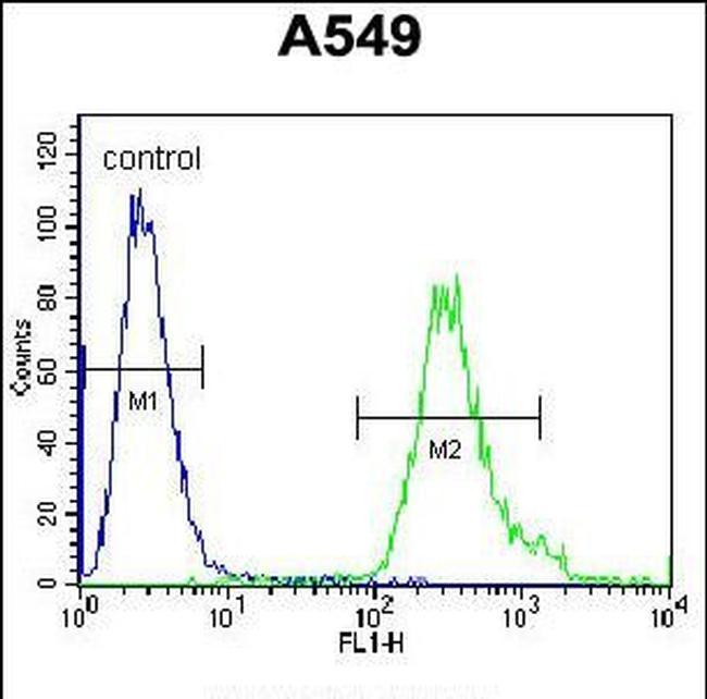 - Flow cytometric analysis of ANKRD58 in A549 cells (right histogram) compared to a negative control cell (left histogram). Samples were probed with a ANKRD58 Antibody (C-term) (Product # PA5-48293). FITC-conjugated goat-anti-rabbit secondary antibodies were used for the analysis.