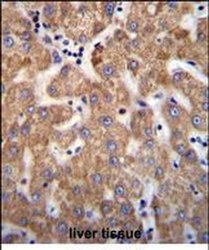 - Immunohistochemical analysis of ANKRD58 in formalin fixed and paraffin embedded human liver tissue. Samples were probed with a ANKRD58 Antibody (C-term) (Product # PA5-48293) followed by peroxidase conjugation of the secondary antibody and DAB staining.
