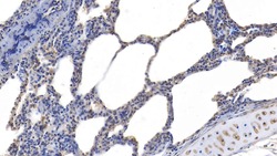 - Immunohistochemistry analysis of GKN2 in paraffin-embedded Human Lung tissue. Samples were incubated with polyclonal antibody (Product # PA5-119134) at a dilution of 20 µg/mL, followed by HRP-Linked Caprine Anti-Rabbit IgG using a dilution of 2 µg/mL.