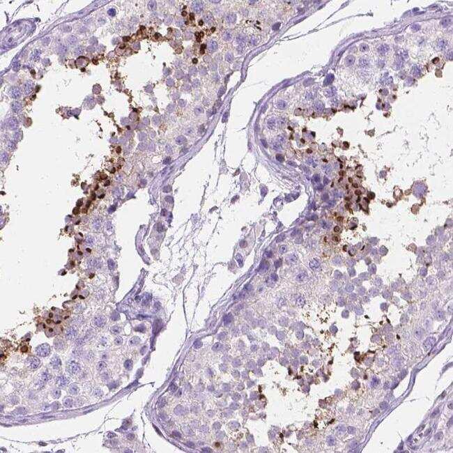 - Immunohistochemical analysis of TMEM210 in human testis using TMEM210 Polyclonal Antibody (Product # PA5-64297) shows high expression.