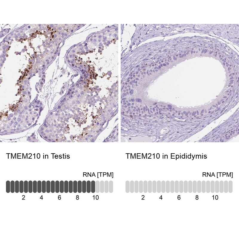 - Immunohistochemical staining of TMEM210 in human testis and epididymis tissues using TMEM210 Polyclonal Antibody (Product # PA5-64297). Corresponding TMEM210 RNA-seq data are presented for the same tissues.