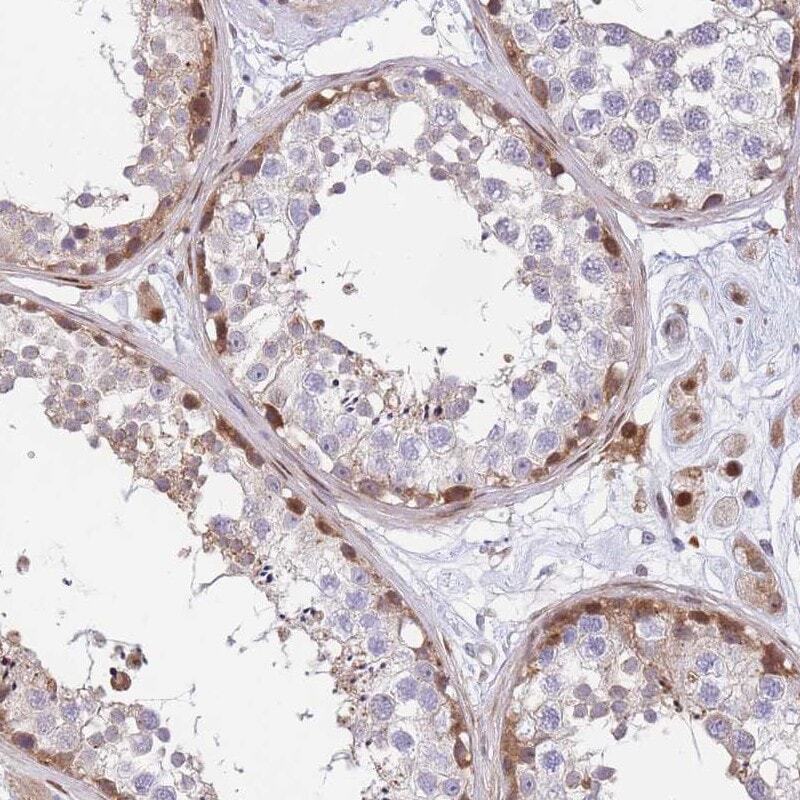 - Immunohistochemical staining of KIAA1211 in human testis using a KIAA1211 Polyclonal Antibody (Product # PA5-61669) shows strong positivity in a subset of cells in seminiferous ducts.