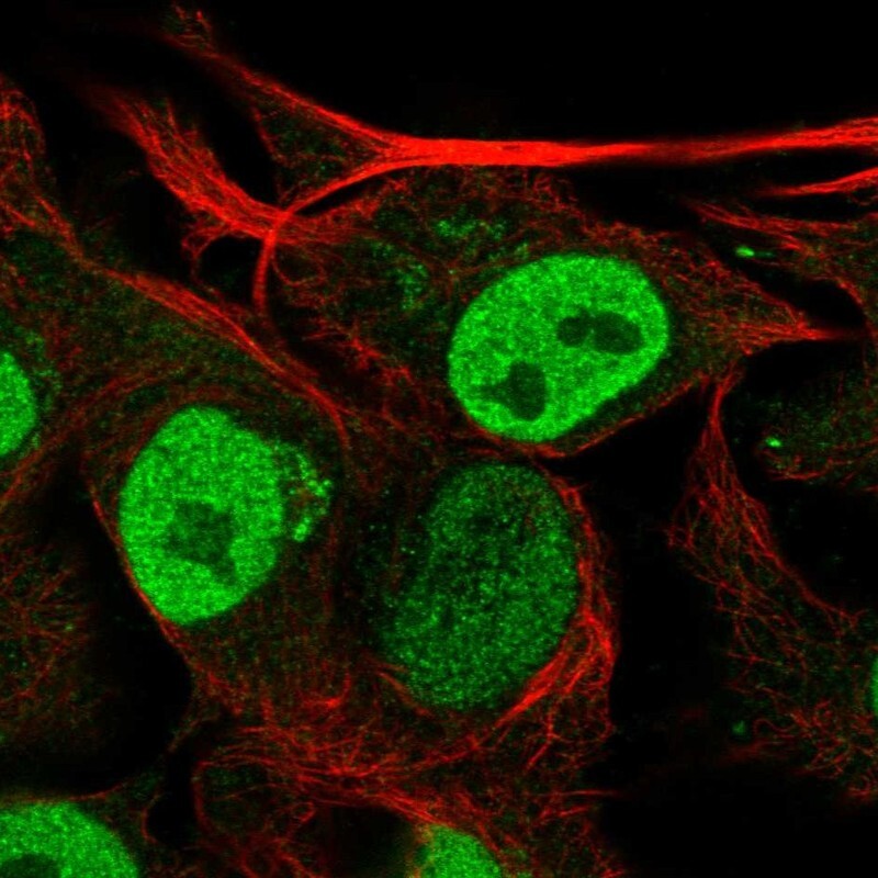 - Immunofluorescent staining of human cell line SK-MEL-30 shows localization to nucleoplasm & the Golgi apparatus.