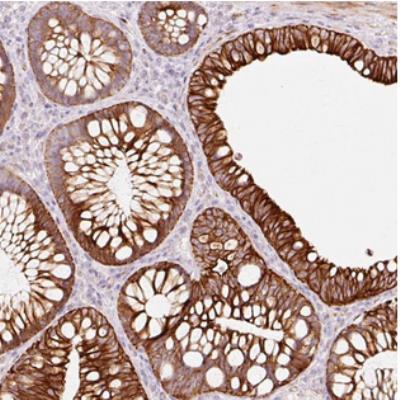 - Immunohistochemistry: TRIM73 Antibody [NBP2-30754] - Staining of human colon shows strong cytoplasmic and membranous positivity in glandular cells.