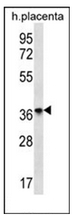 - Western blot analysis of OR8D4 Antibody (C-term) ???in human placenta tissue lysates (35ug/lane). This demonstrates the OR8D4 antibody detected the OR8D4 protein (arrow).