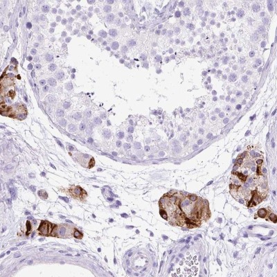 - Immunohistochemistry: Storkhead Box 2 Antibody [NBP2-30480] - Staining of human testis shows strong cytoplasmic positivity in Leydig cells.