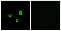 - Immunofluorescence analysis of A549 cells, using OR10G7 antibody. The picture on the right is treated with the synthesized peptide.