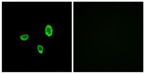 - Immunofluorescence analysis of A549 cells, using OR10G7 antibody.The picture on the right is treated with the synthesized peptide.