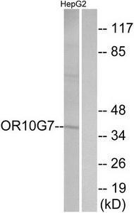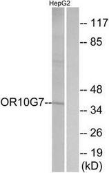 - Western blot analysis of extracts from HepG2 cells, using OR10G7 antibody.The lane on the right is treated with the synthesized peptide.