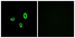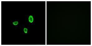 - Immunofluorescence analysis of A549 cells, using OR10G7 Antibody. The picture on the right is treated with the synthesized peptide.
