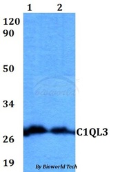 - Western blot (WB) analysis of C1QL3 pAb at 1:500 dilutionLane1:HEK293T whole cell lysateLane2:Raw264.7 whole cell lysate