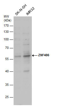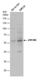 - ZNF486 antibody detects ZNF486 protein by western blot analysis. Various whole cell extracts (30 £gg) were separated by 10% SDS-PAGE, and the membrane was blotted with ZNF486 antibody (GTX123668) diluted by 1:1000.