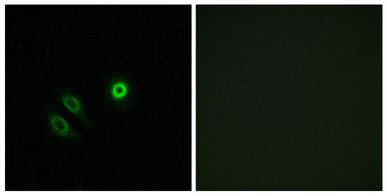 - Immunofluorescence analysis of A549 cells, using OR4X1 antibody. The picture on the right is treated with the synthesized peptide.