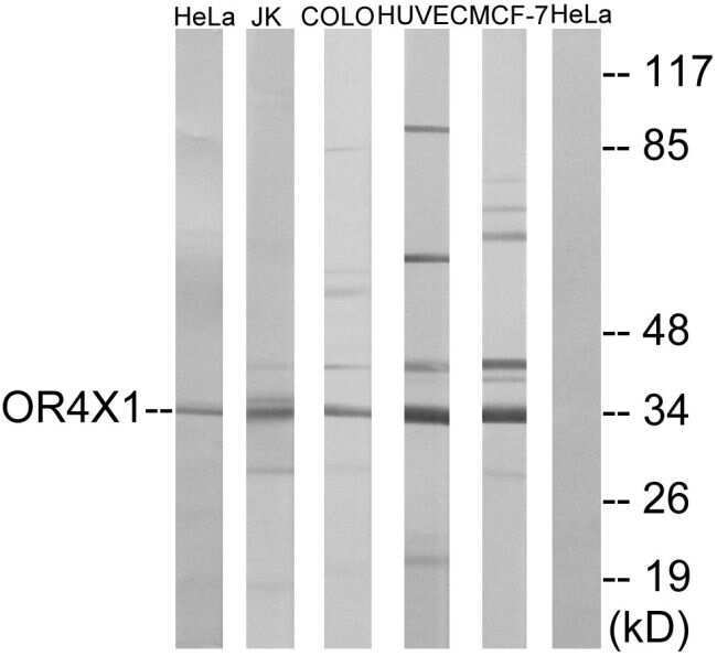 - Western blot analysis of OR4X1 in extracts from HeLa cells, Jurkat cells, COLO cells, HUVEC cells and MCF-7 cells using an OR4X1 polyclonal antibody (Product # PA5-39641).