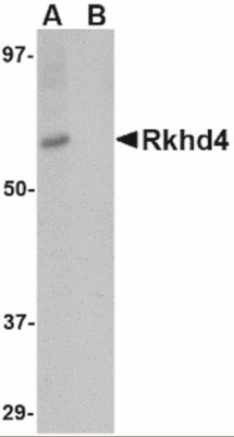 - Western Blot: MEX3A Antibody [NBP2-41092] - Western blot analysis of Rkhd4 in SK-N-SH cell lysate with Rkhd4 antibody at 1 ug/mL in (A) the absence and (B) the presence of blocking peptide.