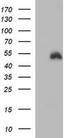 - HEK293T cells were transfected with the pCMV6-ENTRY control (Left lane) or pCMV6-ENTRY IDO1 (Right lane) cDNA for 48 hrs and lysed. Equivalent amounts of cell lysates (5 ug per lane) were separated by SDS-PAGE and immunoblotted with anti-IDO1.