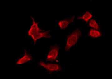 - Immunofluorescent analysis of OR10T2 in HUVEC cell lysate. Samples were fixed with paraformaldehyde, permeabilized with 0.1% Triton X-100, blocked with 10% serum (45 min at 25°C) incubated with OR10T2 polyclonal antibody (Product # PA5-102157) using a dilution of 1:200 (1 hr, 37°C), and followed by goat anti-rabbit IgG Alexa Fluor 594 at a dilution of 1:600.
