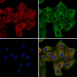 - Immunocytochemistry analysis of OR10T2 in Hela cells. The samples were fixed with PFA and permeabilized in 0.1% Triton X-100, then blocked in 10% serum for 45 minutes at 25°C. Samples were incubated with OR10T2 polyclonal antibody (Product # PA5-102157) and mouse anti-beta tubulin antibody for 1 hour at 37°C. An AlexaFluor594 conjugated goat anti-rabbit IgG(H+L) (Red) and an AlexaFluor488 conjugated goat anti-mouse IgG(H+L) (Green) were used as the secondary antibodies. The nuclear counter stain is DAPI (blue).
