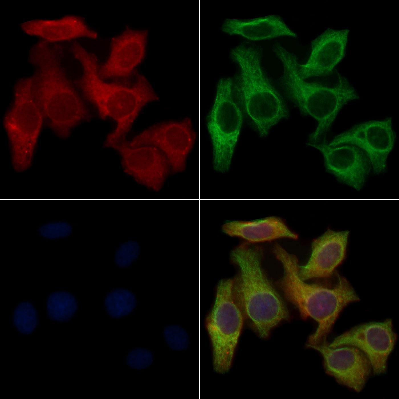 - Immunocytochemistry analysis of OR10H2 in Hela cells. The samples were fixed with PFA and permeabilized in 0.1% Triton X-100, then blocked in 10% serum for 45 minutes at 25°C. Samples were incubated with OR10H2 polyclonal antibody (Product # PA5-102154) and mouse anti-beta tubulin antibody for 1 hour at 37°C. An AlexaFluor594 conjugated goat anti-rabbit IgG(H+L) (Red) and an AlexaFluor488 conjugated goat anti-mouse IgG(H+L) (Green) were used as the secondary antibodies. The nuclear counter stain is DAPI (blue).