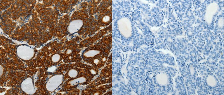 - Predicted cell location: Cytoplasm. Positive control: Human brain and thyroid cancer tissue . Recommended dilution: 1/25-100 The image on the left is immunohistochemistry of paraffin-embedded human thyroid cancer tissue using SELM antibody at dilution 1/25, on the right is treated with the fusion protein. (Original magnification:x200)