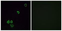 - Immunofluorescence analysis of A549 cells, using OR2G3 antibody.The picture on the right is treated with the synthesized peptide.