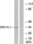 - Western blot analysis of extracts from LOVO cells, using OR11L1 Antibody. The lane on the right is treated with the synthesized peptide.
