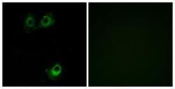 - Immunofluorescence analysis of A549 cells, using OR11L1 Antibody. The picture on the right is treated with the synthesized peptide.