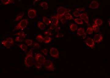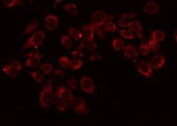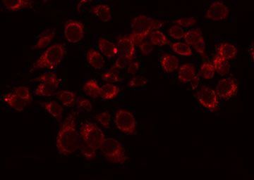 - Immunofluorescent analysis of OR11L1 in LOVO. Samples were fixed with paraformaldehyde, permeabilized with 0.1% Triton X-100, blocked with 10% serum (45 min at 25°C) incubated with OR11L1 polyclonal antibody (Product # PA5-102118) using a dilution of 1:200 (1 hr, 37°C), and followed by goat anti-rabbit IgG Alexa Fluor 594 at a dilution of 1:600.