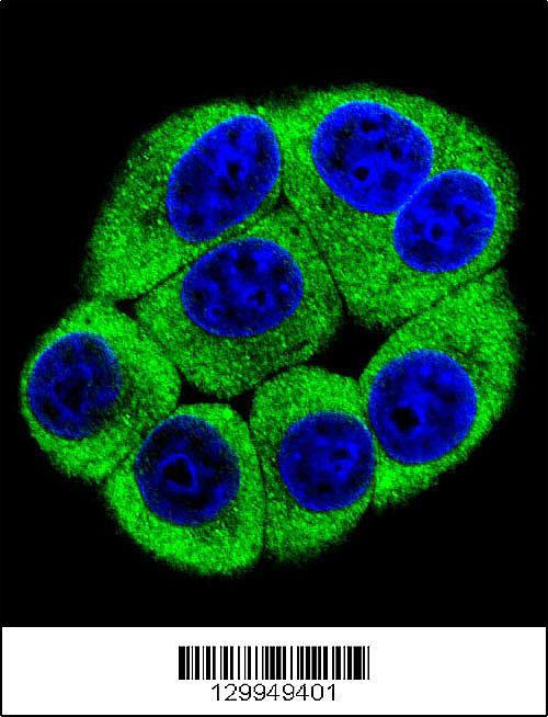 - Confocal immunofluorescent analysis of OR2T3 Antibody (C-term)(Cat#OAAB08164) with 293 cell followed by Alexa Fluor 488-conjugated goat anti-rabbit lgG (green). DAPI was used to stain the cell nuclear (blue).