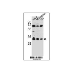 - OR2T3 Antibody (C-term) (Cat. #OAAB08164) western blot analysis in HepG2,MDA-MB453,293 cell line lysates (35µg/lane).This demonstrates the OR2T3 antibody detected the OR2T3 protein (arrow).