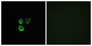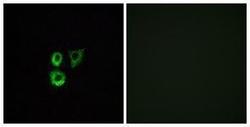 - Immunofluorescence analysis of A549 cells, using OR2T3/2T34 Antibody. The picture on the right is treated with the synthesized peptide.