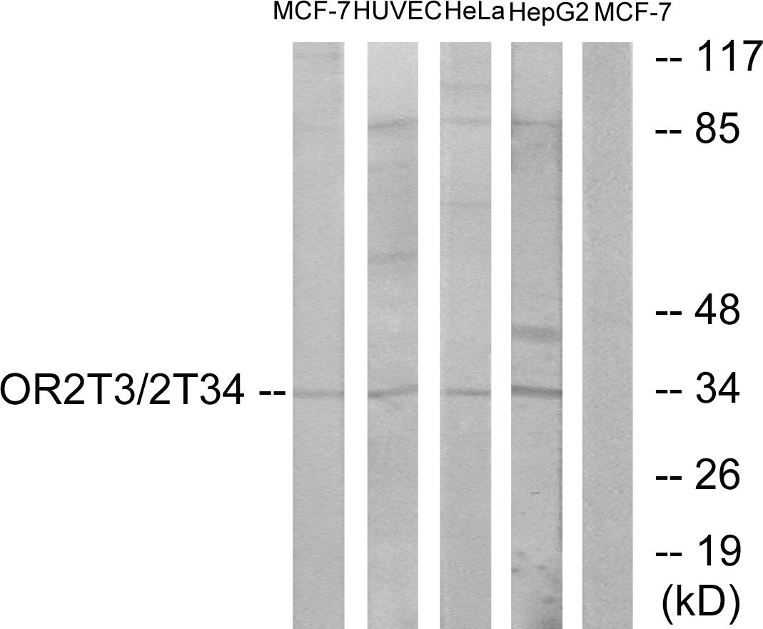 Rabbit polyclonal antibody anti-Olfactory receptor 2T3 and Olfactory receptor 2T34 (240-320 C-Term) is suitable for use in Western Blot, Immunofluorescence, Immunocytochemistry and ELISA research applications.