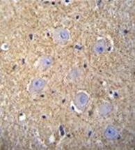- Immunohistochemistry analysis in formalin fixed and paraffin embedded human brain tissue reacted with OR2T3 Antibody (C-term) , which was?peroxidase conjugated to the secondary antibody and followed by?DAB staining. This data demonstrates the use of OR2T3 Antibody (C-term) for immunohistochemistry. Clinical relevance has not been evaluated.