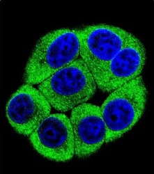 - Immunofluorescent analysis of OR2T3 in 293 cells using confocal microscopy. Samples were incubated with OR2T3 H1 polyclonal antibody (Product # PA5-71600) followed by Alexa Fluor 488-conjugated goat anti-rabbit lgG (green) as a secondary antibody. Nuclei were counterstained with DAPI (blue).