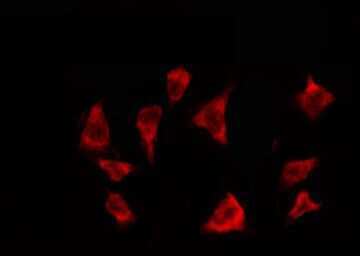 - Immunofluorescent analysis of OR2T3/OR2T34 in MCF7. Samples were fixed with paraformaldehyde, permeabilized with 0.1% Triton X-100, blocked with 10% serum (45 min at 25°C) incubated with OR2T3/OR2T34 polyclonal antibody (Product # PA5-103227) using a dilution of 1:200 (1 hr, 37°C), and followed by goat anti-rabbit IgG Alexa Fluor 594 at a dilution of 1:600.