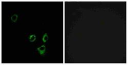 - Western blot analysis of lysates from K562 cells, using OR2T5/2T29 Antibody. The lane on the right is blocked with the synthesized peptide.