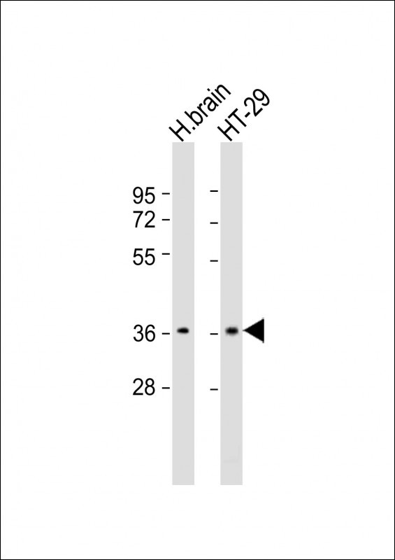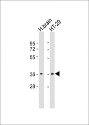 - All lanes: Anti-OR2T7 Antibody (C-term) at 1:2000 dilution. Lane 1: human brain lysate. Lane 2: HT-29 whole cell lysate Lysates/proteins at 20 ug per lane. Secondary Goat Anti-Rabbit IgG, (H+L), Peroxidase conjugated at 1:10000 dilution. Predicted band size: 34 kDa. Blocking/Dilution buffer: 5% NFDM/TBST.