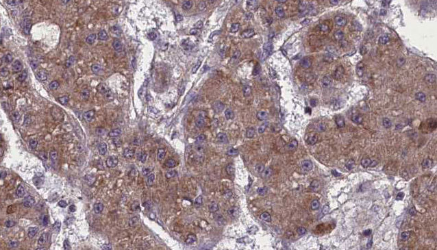 - 1:100 staining human liver carcinoma tissues by IHC-P. The sample was formaldehyde fixed and a heat mediated antigen retrieval step in citrate buffer was performed. The sample was then blocked and incubated with the antibody for 1.5 hours at 22°C. An HRP conjugated goat anti-rabbit antibody was used as the secondary.