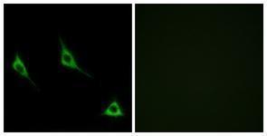 - Immunofluorescence analysis of LOVO cells, using OR51A7 Antibody. The picture on the right is treated with the synthesized peptide.