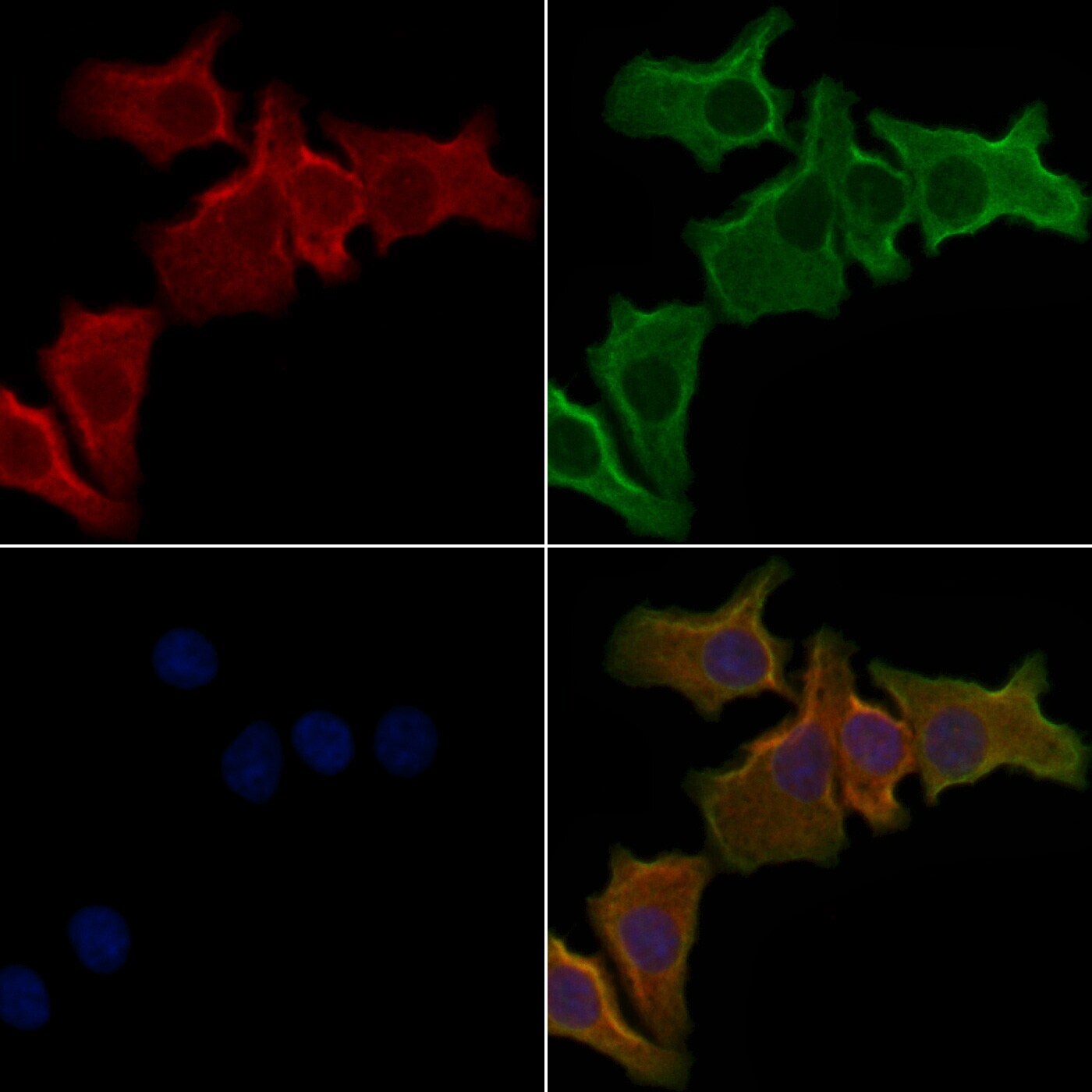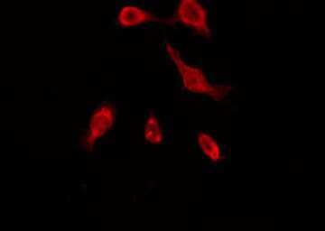 - Immunofluorescent analysis of OR51A7 in COLO205 cells. Samples were fixed with paraformaldehyde, permeabilized with 0.1% Triton X-100, blocked with 10% serum (45 min at 25°C) incubated with OR51A7 polyclonal antibody (Product # PA5-102202) using a dilution of 1:200 (1 hr, 37°C), and followed by goat anti-rabbit IgG Alexa Fluor 594 at a dilution of 1:600.