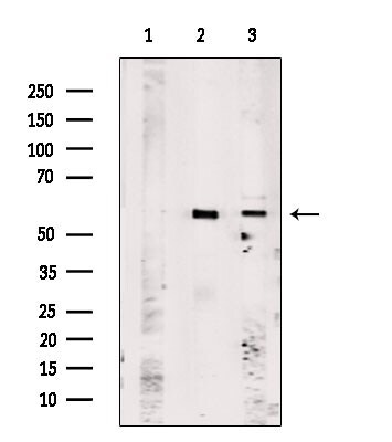 - Western blot analysis of OR51A7 in extracts from various samples. Samples were incubated with OR51A7 polyclonal antibody (Product # PA5-102202). Lane 1: HepG2 cells, blocked with antigen-specific peptides; Lane 2: HepG2 cells; Lane 3: A375 cells.