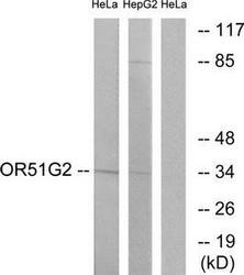 - Western blot analysis of extracts from HeLa cells and HepG2 cells, using OR51G2 antibody.The lane on the right is treated with the synthesized peptide.