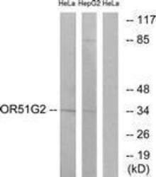 - Western blot analysis of extracts from HeLa/HepG2 cells, using OR51G2 Antibody. The lane on the right is treated with the synthesized peptide.