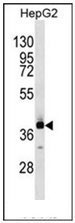 - Western blot analysis of OR51G2 Antibody (C-term) Cat.-No AP53070PU-N in HepG2 cell line lysates (35ug/lane). This demonstrates the OR51G2 antibody detected the OR51G2 protein (arrow)