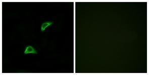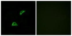 - Immunofluorescence analysis of LOVO cells, using OR51A4 Antibody. The picture on the right is treated with the synthesized peptide.