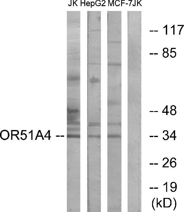 - Western blot analysis of lysates from Jurkat, HepG2, and MCF-7 cells, using OR51A4 Antibody. The lane on the right is blocked with the synthesized peptide.