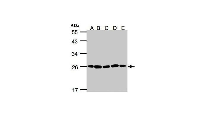 - Sample(30?g of whole cell lysate)A: H1299B: HeLa S3 C: Hep G2 D: MOLT4 E: Raji 12% SDS PAGEOAGA00243 diluted at 1:1000