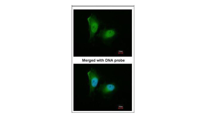 - Immunofluorescence analysis of paraformaldehyde-fixed HeLa, using 20S Proteasome alpha2(OAGA00243) antibody at 1:200 dilution.