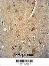- C7orf28A Antibody (Center) (Cat. #AP5454c) immunohistochemistry analysis in formalin fixed and paraffin embedded human brain tissue followed by peroxidase conjugation of the secondary antibody and DAB staining. This data demonstrates the use of the C7orf28A Antibody (Center) for immunohistochemistry. Clinical relevance has not been evaluated.